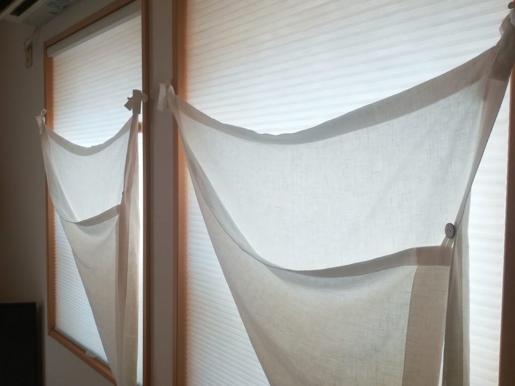 シルエットシェードだけだとシンプルすぎるので、麻の素材の飾りカーテンもつけています。