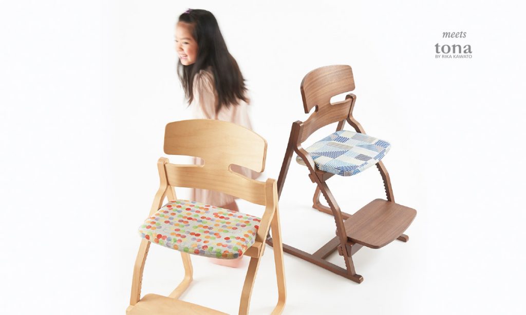 座面がクッションになっているところ。(トリップトラップはクッション別売り)このファブリックは、デザイナーさんとのコラボです。