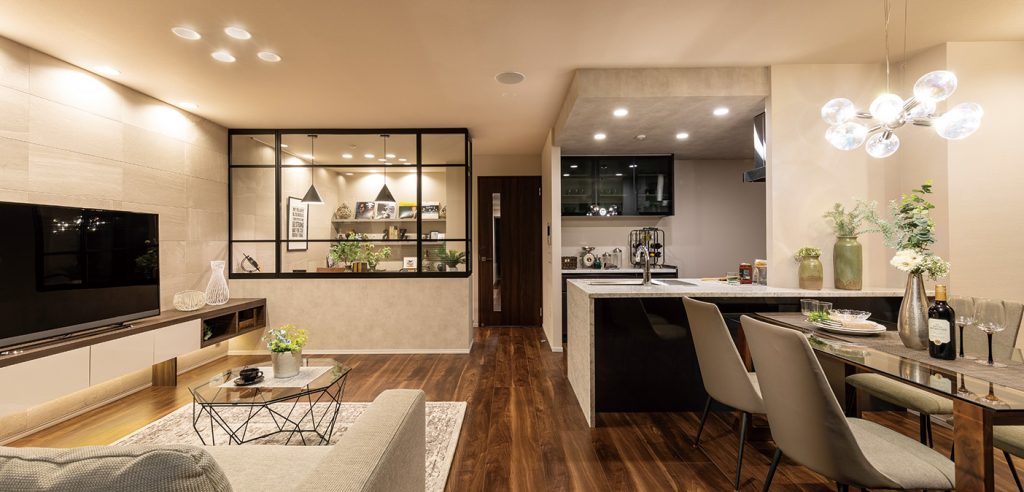 インダストリアル(男性的)なイメージに偏りすぎないよう、適度に上品な要素もプラスしつつ(マンションは女性の心もつかまないといけませんので^^)、カジュアルすぎないよう、ちょこっと高級感もプラスしながらコーディネートしました。