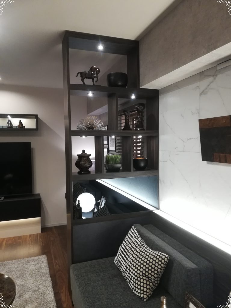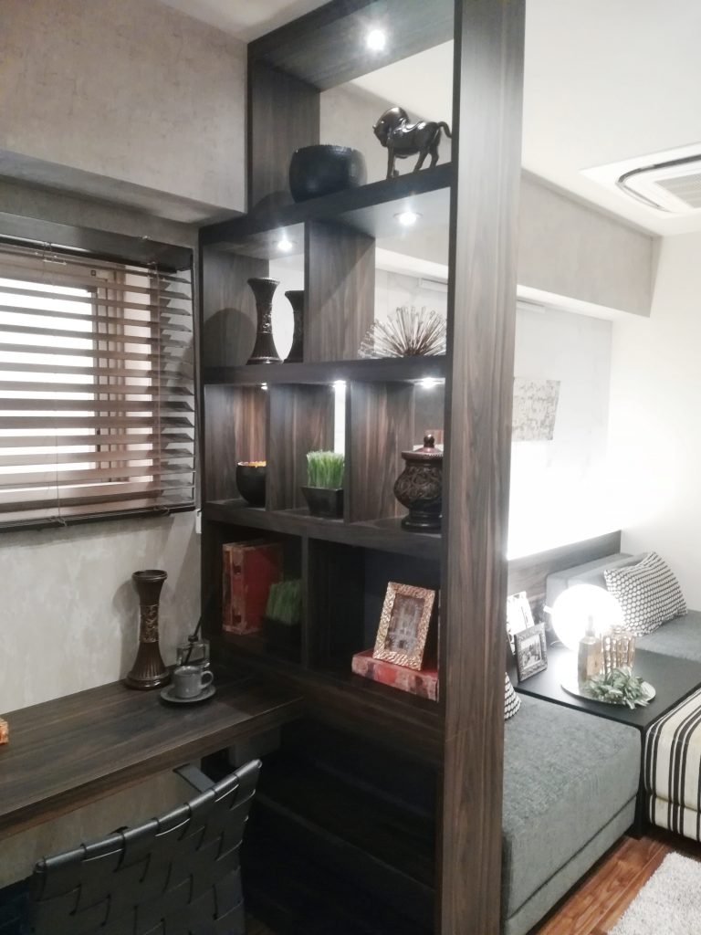 リビング側は、部分的にブラックミラーを貼っているので、なんとなく奥行き感が。