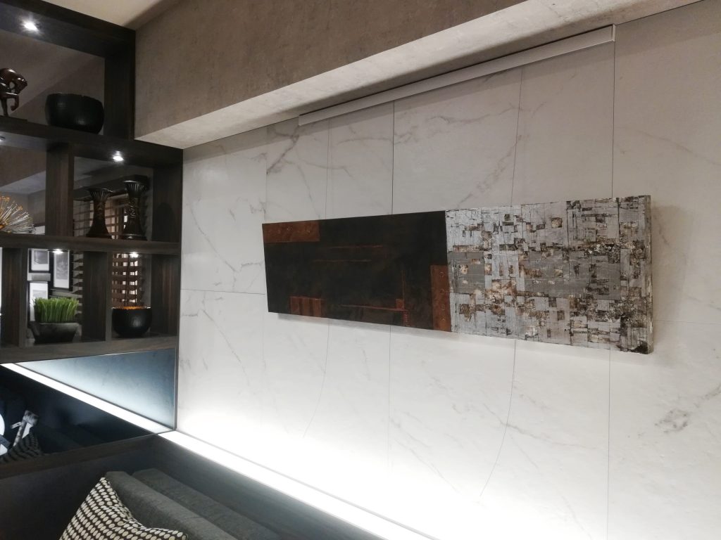 ソファ背面は、大判(600角)タイル貼り+間接照明でドラマティックに。アートはお部屋に合わせてオーダーしました^^