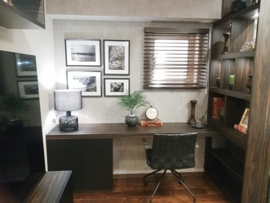 ご主人様の書斎コーナー。マンションの営業さんより、ご主人は「写真が趣味という設定で」とのことでしたので、現像した写真を飾って演出。