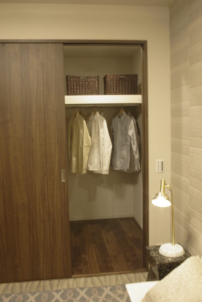モデルルームの主寝室は、「ホテルライク」なご提案が多いのですが、こちらも例にもれず、カーペット式のホテルのような高級感とくつろぎ感のあるご提案をさせていただきました。