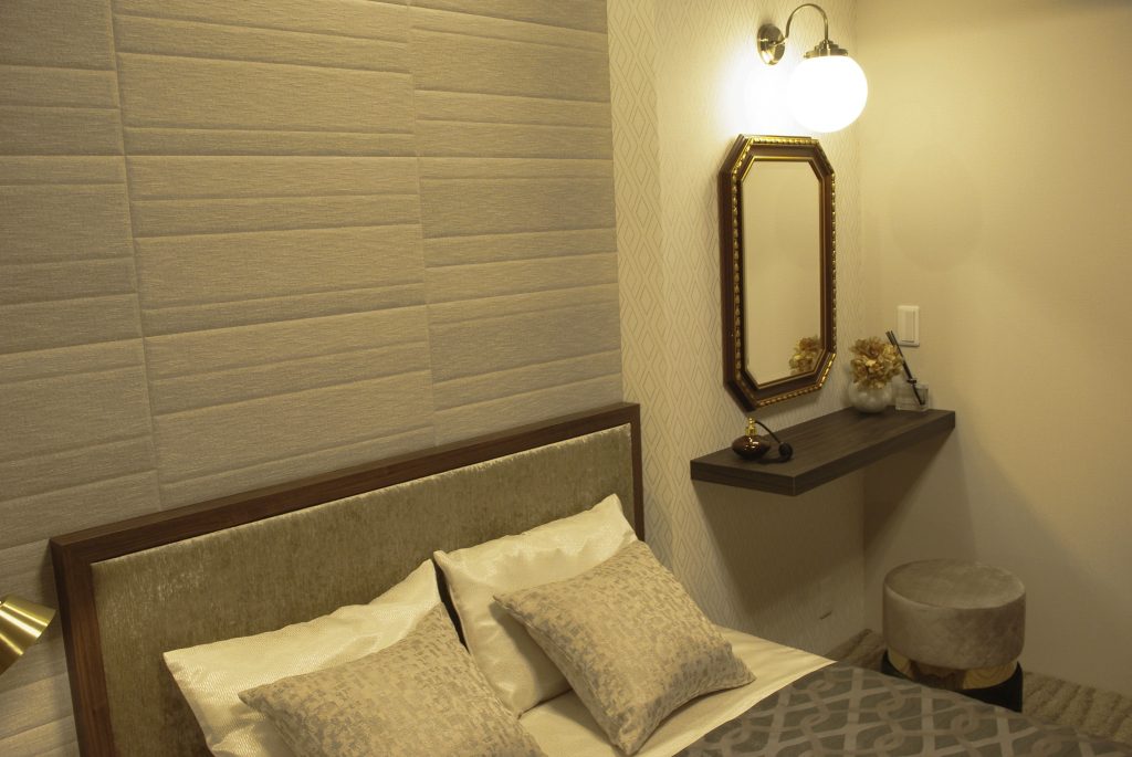 よく見ると、ドレッサー用カウンターのある壁面は柱の関係で段差があるのですが、そこのクロスを替えています。「ベッドコーナー」と「ドレッサーコーナー」を、壁面の素材で区切っているともいえますね。