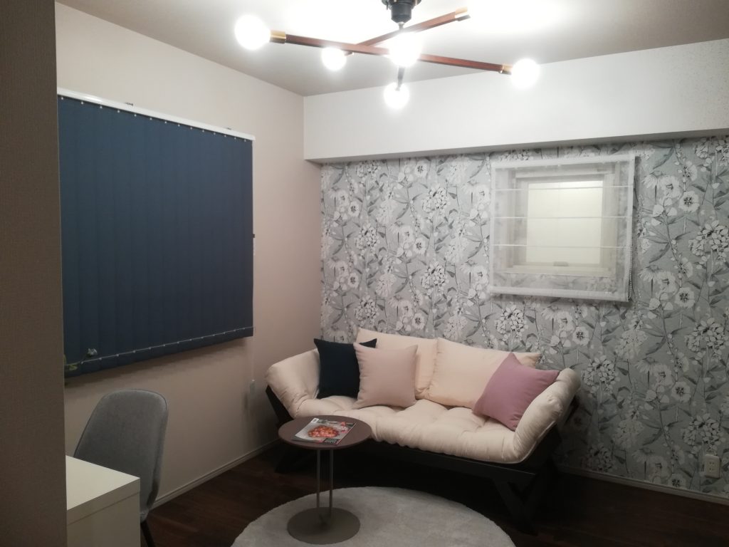 アクセントクロスに貼った海外の壁紙。大柄で華やかな花柄なのですが、落ち着いたブルーなので、幅広い年齢層に受け入れられそうです。壁一面がアートのような、上品な女性らしさが素敵です♪