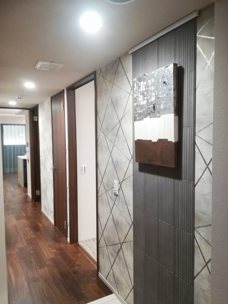 玄関にエコカラット+アートでアクセントをつくり、廊下の壁はメタリック感のあるクロスに。