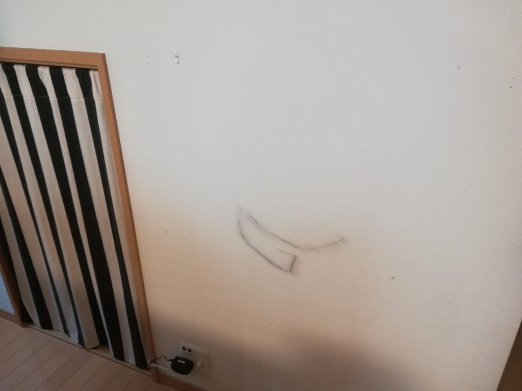 まだ下の子が1〜2歳の頃、無邪気にクロス(壁紙)に油性マジックで落書きした跡です。^^;