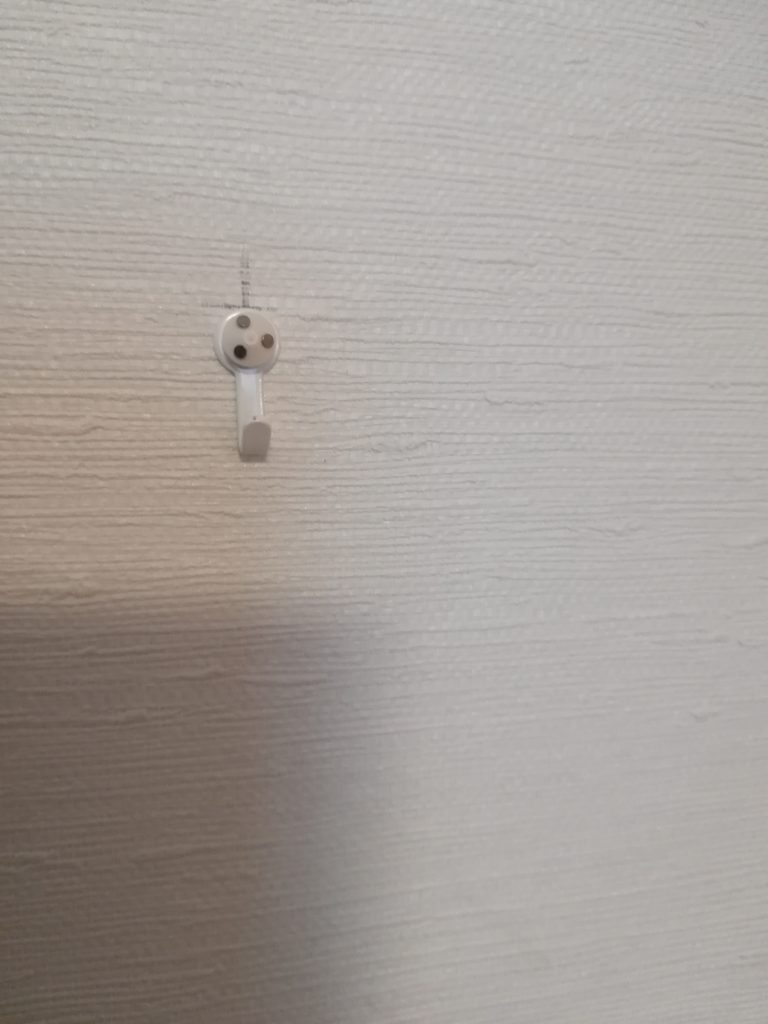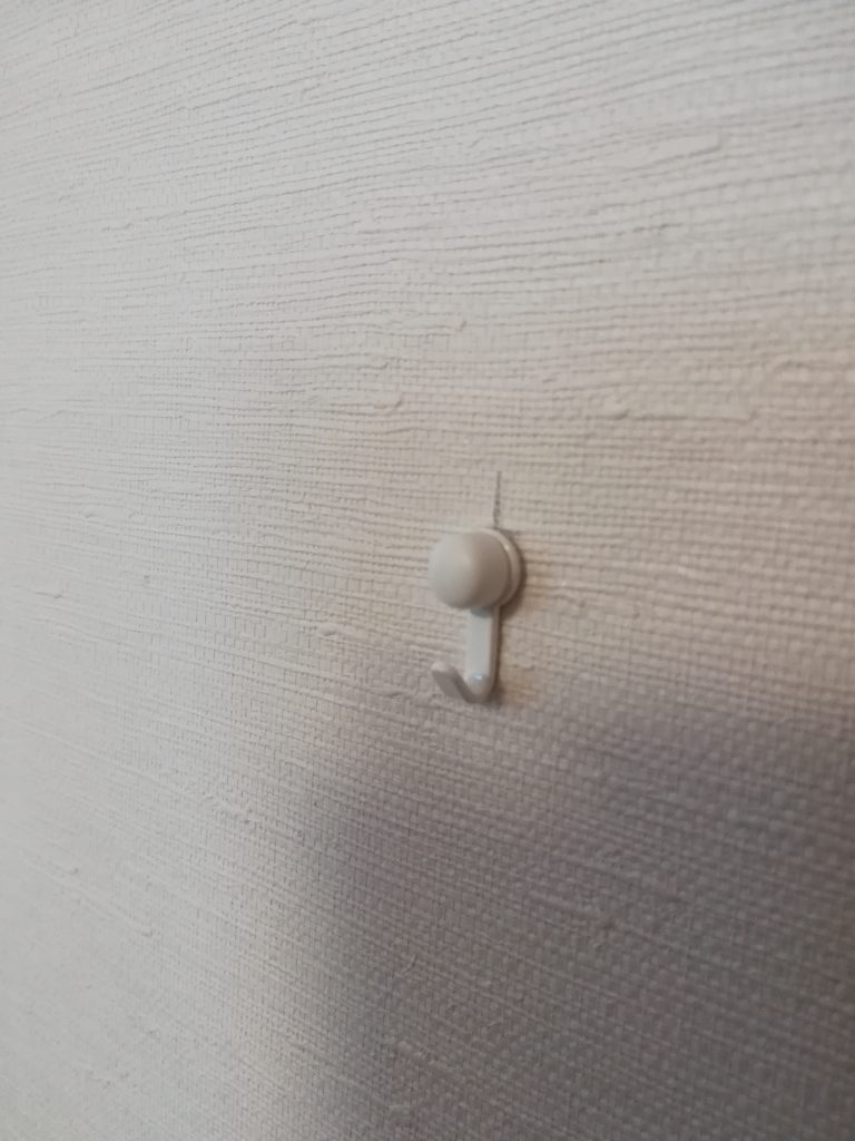 こんな感じで、取り付けたい場所に印を付けて、石膏ボード用フックを付けます。