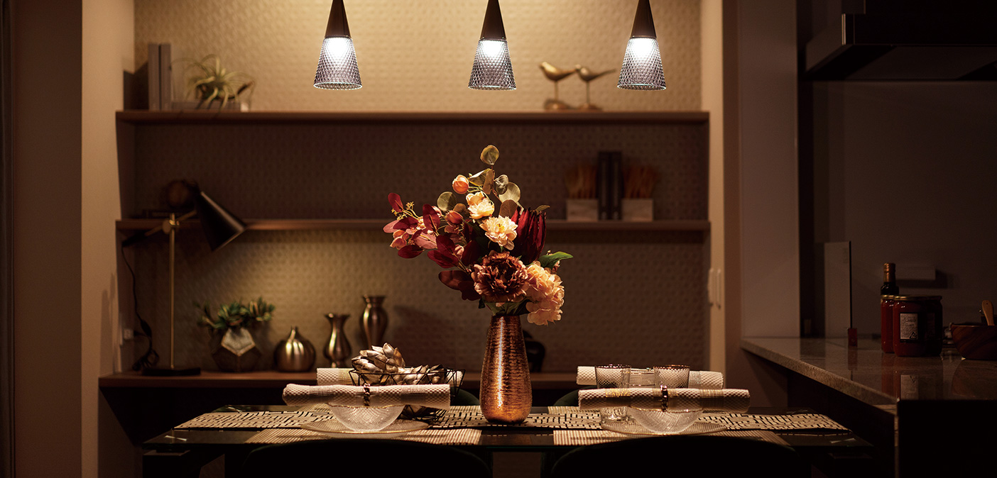 ラグジュアリーな中にも、自然モチーフの壁紙をアクセントクロスにし、ちょっぴりリゾート感も感じるイメージに仕上げています。その他のクロスもベージュ系でしっとりした雰囲気に。