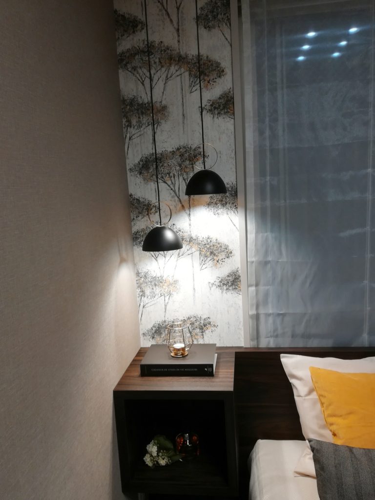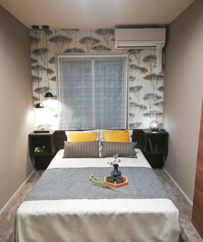 当初、ベッドの両サイドにペンダントを吊るす予定でしたが、エアコンが干渉することが判明した為、片側に寄せました。
