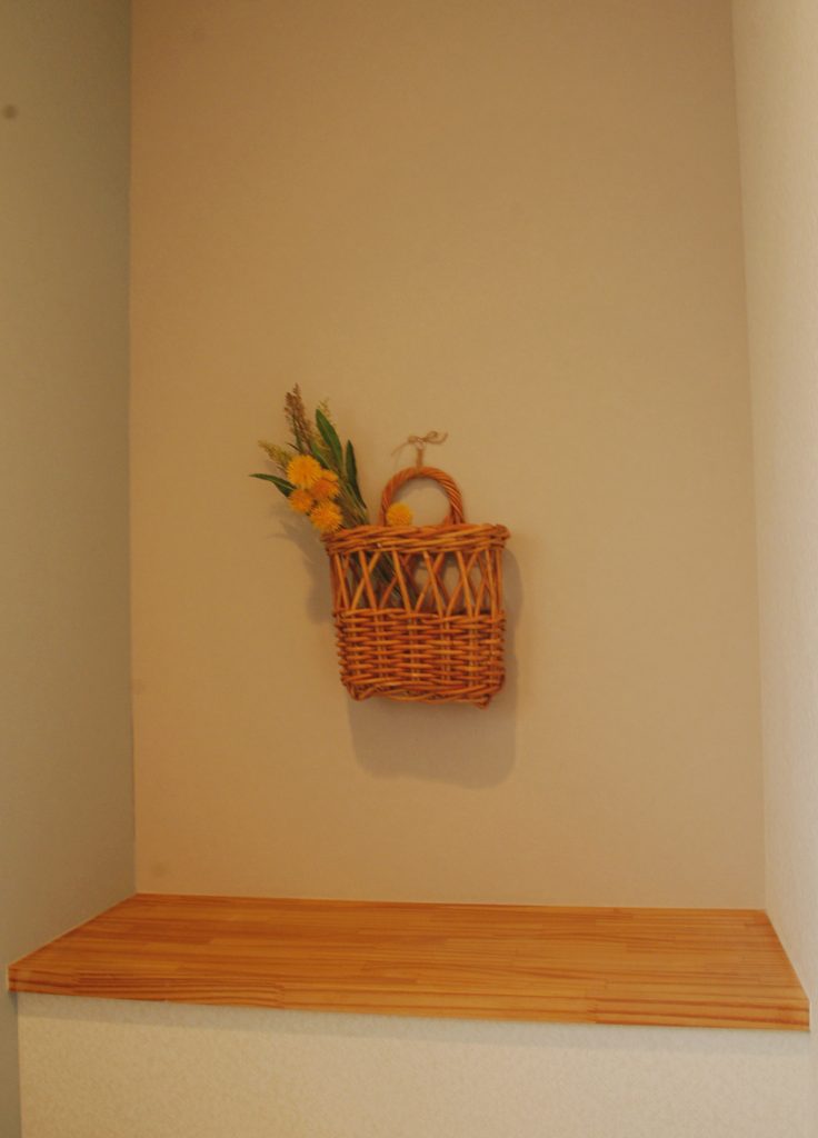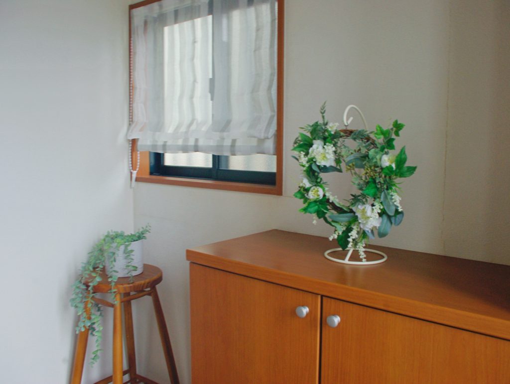 下足箱の上には、お友達の花屋さんでオーダーしたフェイクグリーンのリースを。お客様のHPに掲載されていたグリーンのイメージで作ってもらいました。