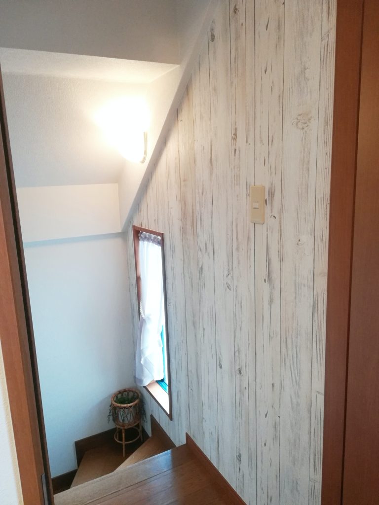 ホワイト系の木目のクロスで、ちょっとお外っぽく&お店に入る感じをイメージしました。