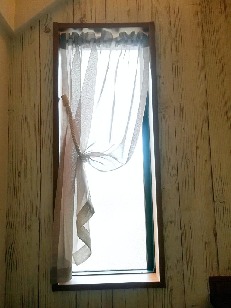 カーテンの上部はそのままフラットに縫うのではなく、上部に余裕を持たせて、ニュアンスを出しています。ロープのタッセルもお外っぽいポイント。色はわかりにくいですが、淡いベージュです。