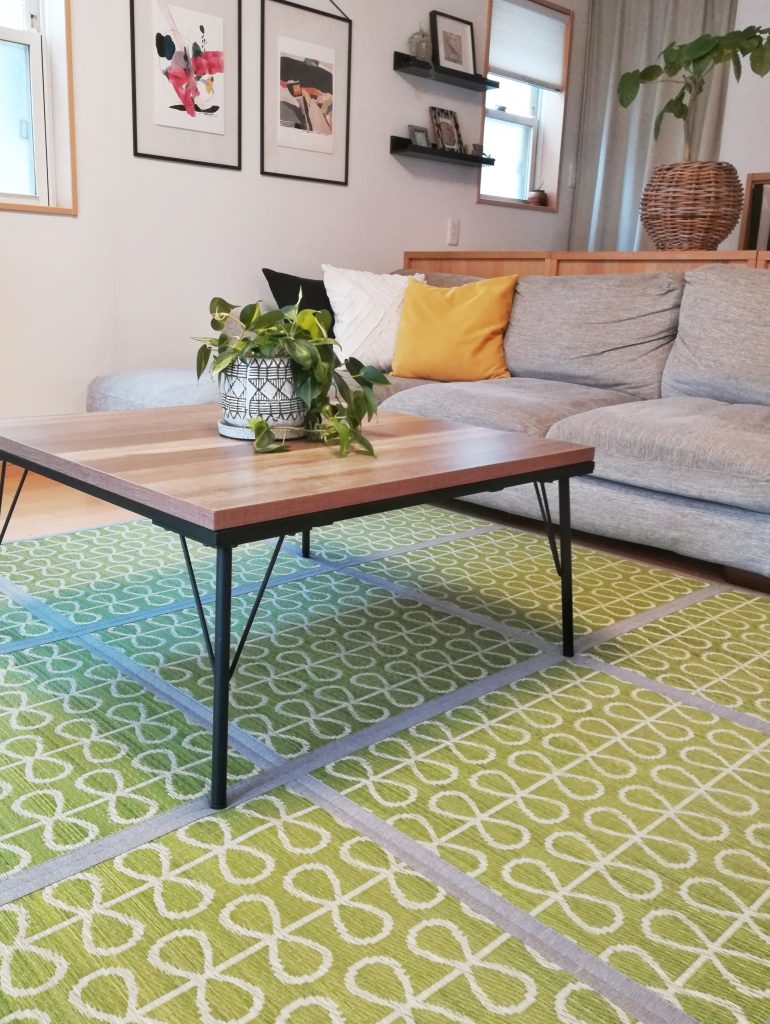 クッションの色もラグの色に合わせています。グリーンとイエローの組み合わせが昔から大好きです♪(初夏って感じ。もうほとんど盛夏だけど)