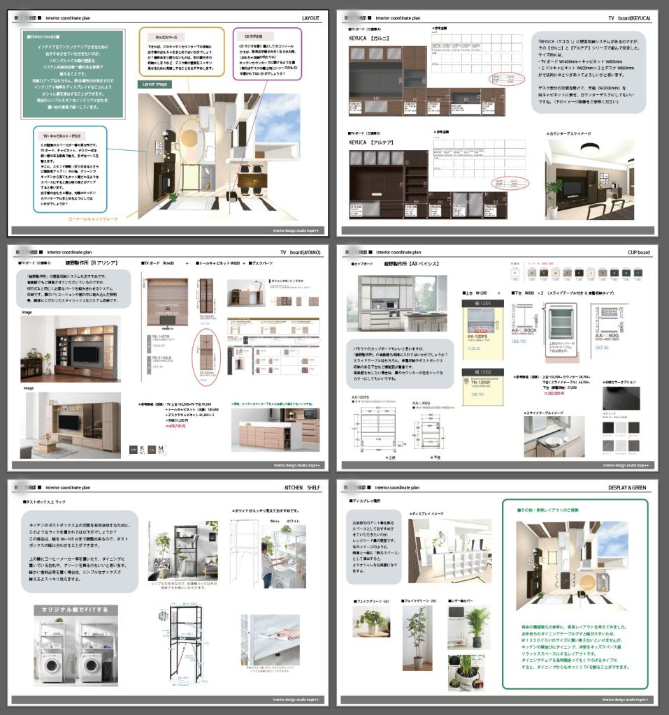 コンセプト、家具レイアウト、ご提案商品(+商品リンク)、3Dパース等